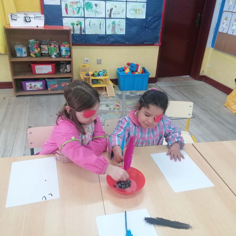 No JI de Ponte a descoberta de Luís de Camões foi explorada com vários trabalhos: descobrimos a sensação de trabalhar apenas com um olho e desenhar com uma pena, o que permitiu às crianças perceberem os desafios da escrita no tempo de Camões. Exploramos o poema “ verdes são os campos”, desenhamos o rosto de Camões, fazendo a dobragem da gola da roupa e, por fim, descobrimos palavras que rimavam com Camões.