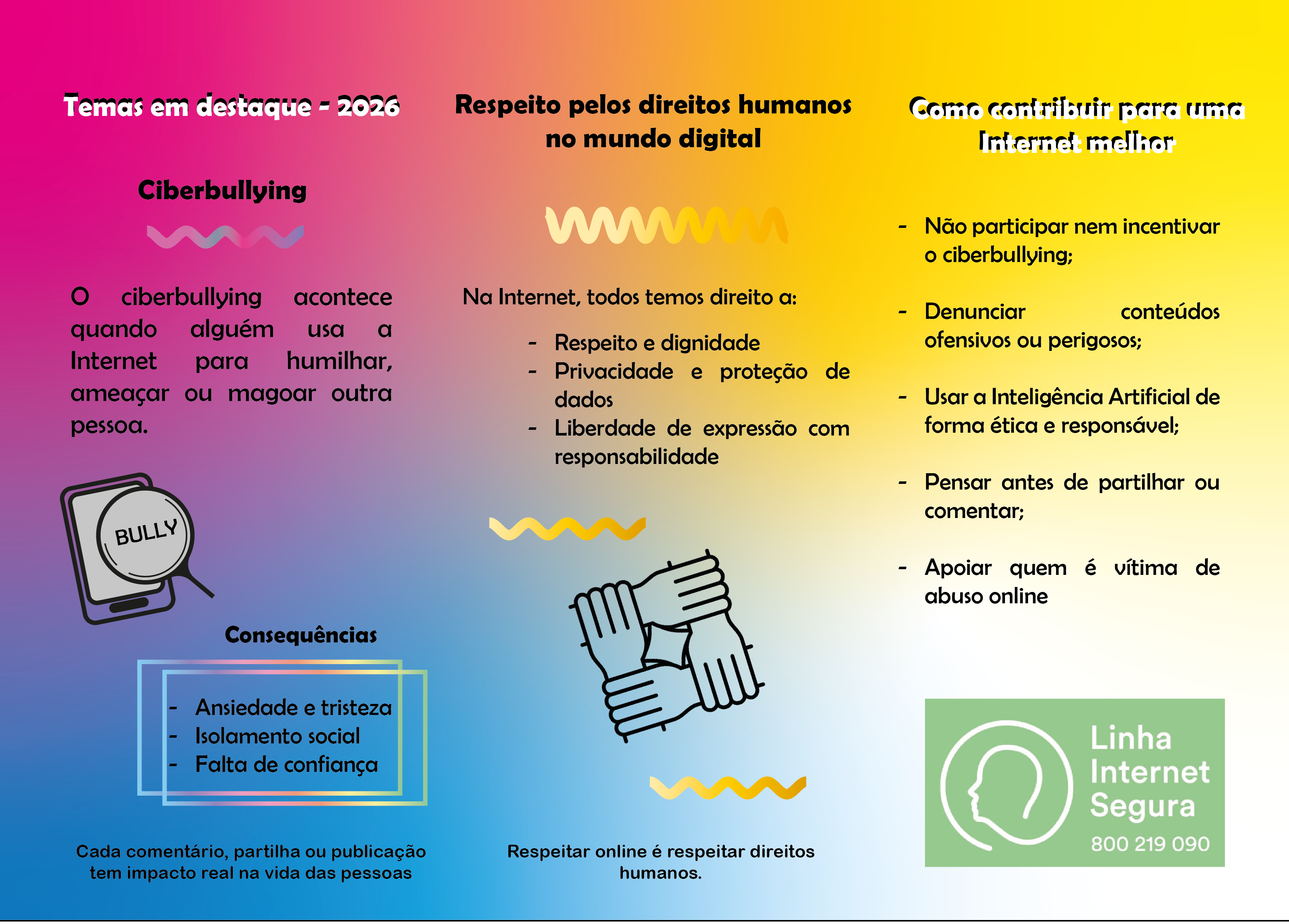 Como forma de sensibilizar a comunidade educativa para temas como o ciberbullying e o respeito pelos direitos humanos no mundo digital, os alunos da turma do 1.º B do Curso Profissional Técnico de Multimédia, no âmbito das disciplinas Técnicas de Multimédia e Programação Web, desenvolveram um desdobrável informativo.